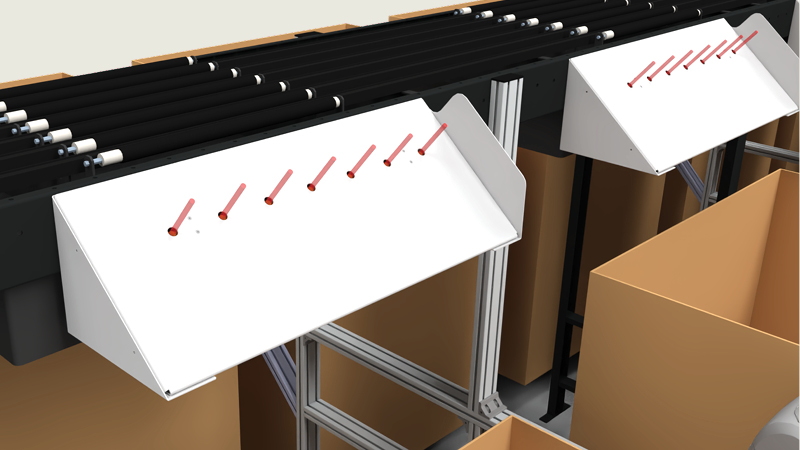 The sensors on this setup are mounted underneath the chutes. They use a laser array with seven sensors that detect the parcel as it passes over holes in the chute itself. If the sensors detect that the wrong package has entered the chute, the system will alert the operator so that the mis-sorted package can be removed.